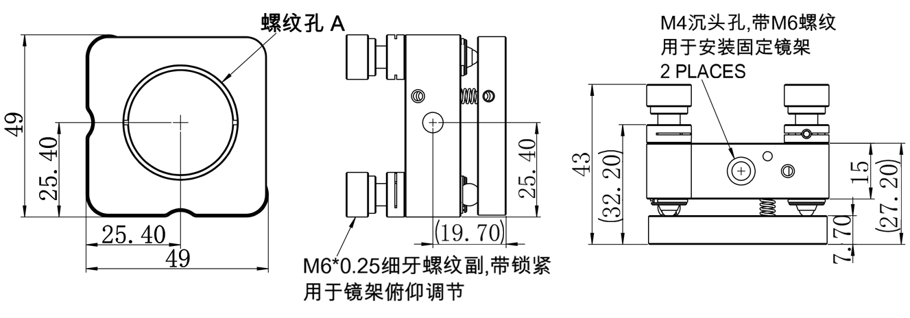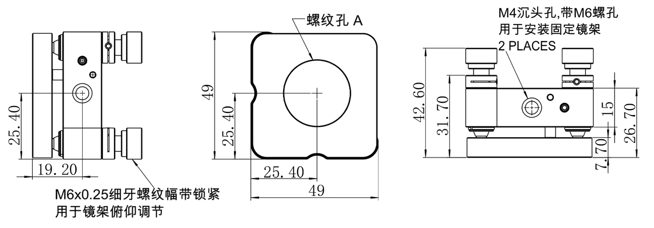 | 规格型号 | 安装螺纹孔A | 适用镜片尺寸 | 支持最大镜片厚度 | 备注 |